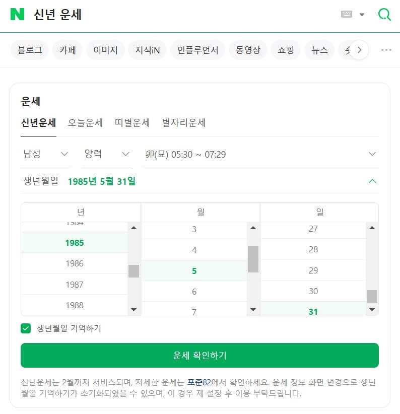 [사진=네이버] 네이버에 신년운세를 검색하면 네이버 운세 서비스에서 신년 운세를 확인할 수 있습니다. 신년운세 탭은 12월 중순부터 2월까지만 운영하고, 그 외의 기간에는 사라집니다. 성별과 생년월일시를 입력하고 운세 확인하기 버튼을 누르면 새해 총운부터 애정운, 금전운, 직장운, 학업운, 건강운을 확인할 수 있고, 새해 월별운세와 평생운세도 볼 수 있습니다. 운세를 자주 본다면, 생년월일 기억하기를 체크해 주세요!