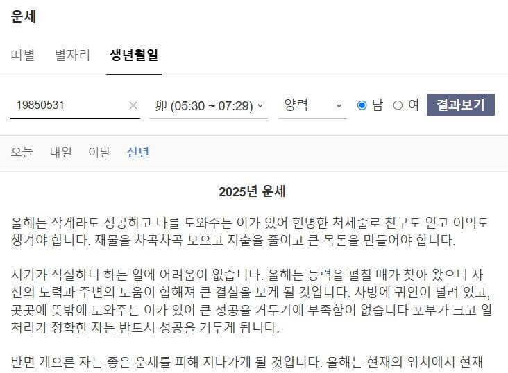 [사진=다음] 다음에는 다음 생년월일운세로 검색해야 곧바로 다음 운세 서비스가 나옵니다. 마찬가지로 성별과 생년월일시를 입력하고 결과보기 버튼을 누른 뒤 신년을 클릭하면 신년운세를 볼 수 있습니다. 네이버 운세처럼 종류별로 세세하게 나누어져있지는 않고, 정리된 새해 총운만 간단히 확인할 수 있습니다.