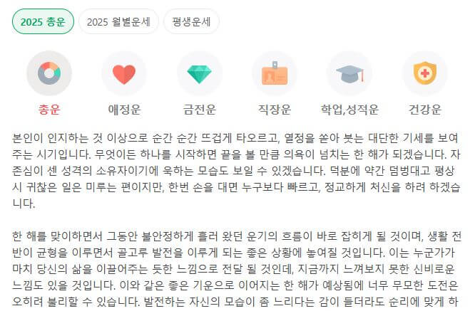 다음에는 다음 생년월일운세로 검색해야 곧바로 다음 운세 서비스가 나옵니다. 마찬가지로 성별과 생년월일시를 입력하고 결과보기 버튼을 누른 뒤 신년을 클릭하면 신년운세를 볼 수 있습니다. 네이버 운세처럼 종류별로 세세하게 나누어져있지는 않고, 정리된 새해 총운만 간단히 확인할 수 있습니다.