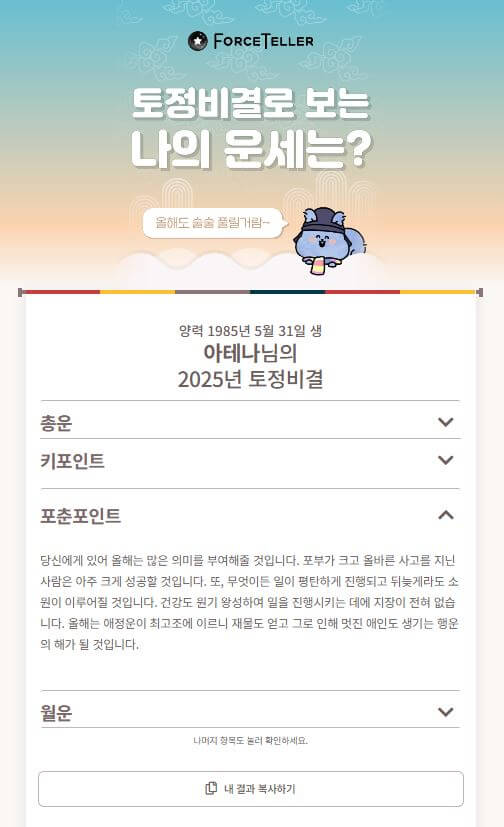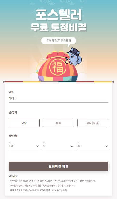 [사진=포스텔러] 포스텔러는 구글 플레이스토어 100만 회 이상 다운로드 및 평점 4.7점을 자랑하는 사주 타로 어플입니다. 하지만 위의 첫 번째 링크를 클릭하면 어플을 다운로드하지 않고도 포스텔러 무료 토정비결 페이지에 들어가 신년운세를 볼 수 있습니다. 새해 무료 토정비결 운세는 3월 15일까지만 운영합니다. 이름과 생년월일을 입력하고 토정비결 확인을 클릭하면 새해 총운, 키포인트, 포춘포인트(행운포인트), 월운을 확인할 수 있습니다. 만약 포스텔러의 재밌는 무료 운세들을 더 보고 싶다면 두 번째 링크를 클릭해 주세요!